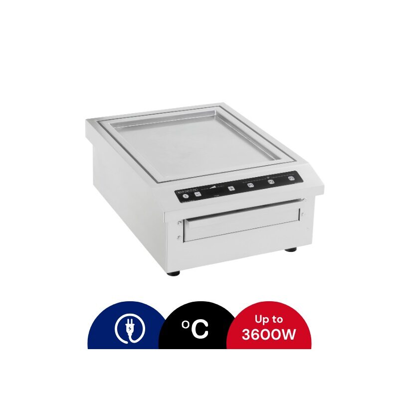 En induktion med en kokyta på 370 x 300 mm. Den har en integrerad kontrollpanel i glas, en startknapp, två temperaturvalsknappar och 3 minnesprogramknappar. Temperaturerna kan ställas in från 50°C till 250°C i steg om 10°C.